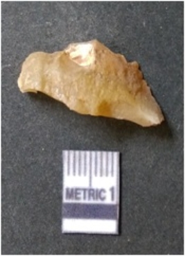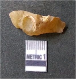| Description / विवरण | The lithic piece is a detached piece from the core and the flat surface with flake scars is evident as the result of core reduction process. Some part of cortex is visible on the surface. |