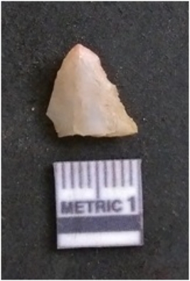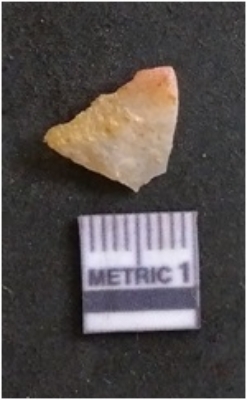 | Description / विवरण | The quartz flake has irregular fracture pattern and sharp flaked edges as a result of lithic knapping activity. The piece is pale, with surfacial flake scars and a bulbous end. |