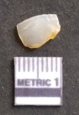 | Description / विवरण | It is a chalcedony flake, with a bulb of percussion on the ventral side. Cortex on one end. |