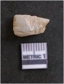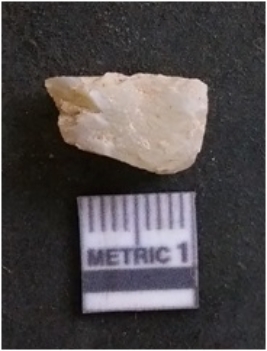 | Description / विवरण | The quartz flake has irregular fracture pattern and sharp flaked edges as a result of lithic knapping activity. The piece is pale, with surfacial flake scars and a bulbous end. |
