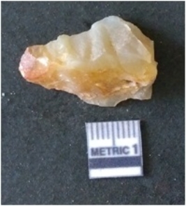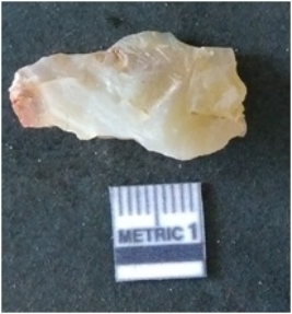| Description / विवरण | It is chalcedony flake, translucent in appearance. The piece shows sharp pointed ends and flake scars on the surface as a result of flaking. The piece shows a bulb of percussion. |