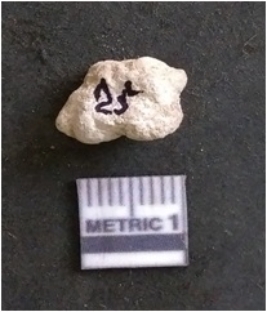 | Description / विवरण | The quartz flake has irregular fracture pattern and sharp flaked edges as a result of lithic knapping activity. The piece is pale, with surfacial flake scars and a bulbous end. |