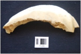| Description / विवरण | Fragment of shell circlet has cut marks, partly irregular interior and medium polished. |