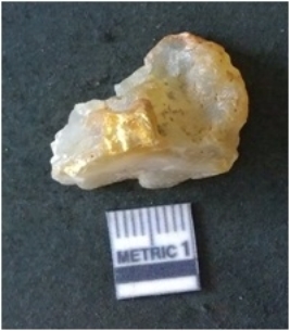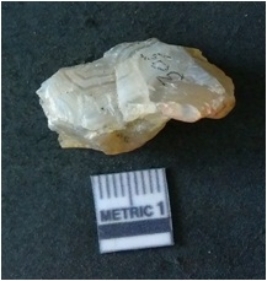 | Description / विवरण | It is chalcedony flake, translucent in appearance. The piece shows sharp pointed ends and flake scars on the surface as a result of flaking. The piece shows a bulb of percussion. |