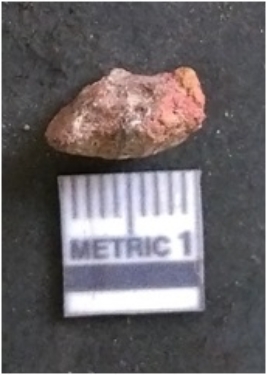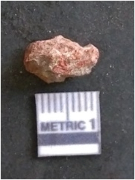 | Description / विवरण | The carnelian flake is red in colour, with angular flaked edges and a bulbous end. The piece has sharp pointed end and a crypto-crystalline matrix. The piece is reddish in colour; with silica base. |