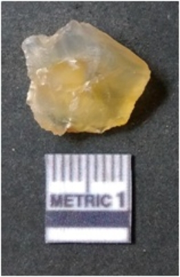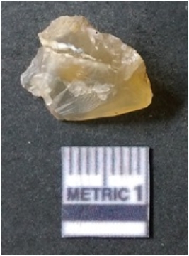 | Description / विवरण | It is chalcedony flake, translucent in appearance. The piece shows sharp pointed ends and flake scars on the surface as a result of flaking. The piece shows a bulb of percussion. |