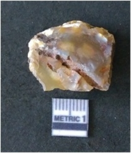 | Description / विवरण | It is chalcedony flake, translucent in appearance. The piece shows sharp pointed ends and flake scars on the surface as a result of flaking. The piece shows a bulb of percussion. |