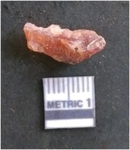 | Description / विवरण | The carnelian flake is red in colour, with angular flaked edges and a bulbous end. The piece has sharp pointed end and a crypto-crystalline matrix. The piece is reddish in colour; with silica base. |