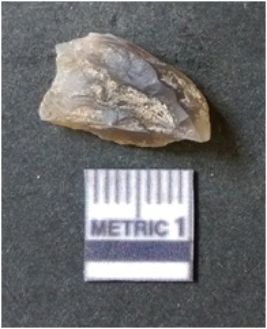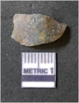 | Description / विवरण | The flake has irregular fracture pattern and sharp flaked edges as a result of lithic knapping activity. The piece is pale, with surfacial flake scars and a bulbous end. The flake is of smoky quartz variety, grayish in colour and translucent in appearance. |