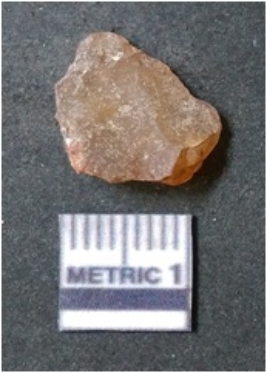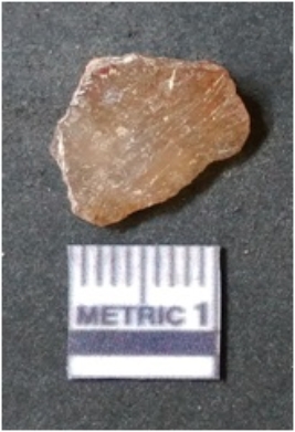| Description / विवरण | The flake has irregular fracture pattern and sharp flaked edges as a result of lithic knapping activity. The piece is pale, with surfacial flake scars and a bulbous end. The quartz flake is rosy white in colour. |