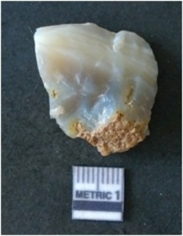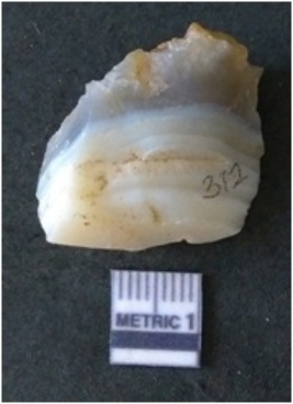 | Description / विवरण | The agate piece is translucent in appurtenance, with angular flaked edges and a bulb of percussion. The piece shows flake scars on the surface. |