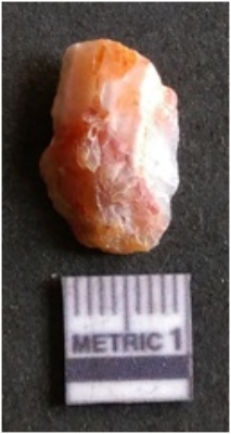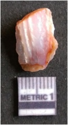 | Description / विवरण | The rosy quartz flake has sharp flaked edges and pointed ends as a result of flaking. The piece is semi-transparent in nature with irregular fracture pattern. The piece is roughly triangular in shape and has a prominent bulb of percussion. |