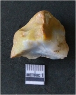 | Description / विवरण | The quartz flake has sharp flaked edges and pointed ends as a result of flaking. The piece is semi-transparent in nature with irregular fracture pattern. The piece is roughly triangular in shape and has a prominent bulb of percussion. |