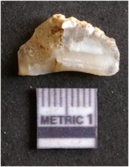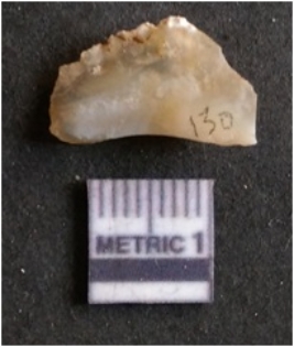 | Description / विवरण | The quartz flake has sharp flaked edges and pointed ends as a result of flaking. The piece is semi-transparent in nature with irregular fracture pattern. The piece is roughly triangular in shape and has a prominent bulb of percussion. |