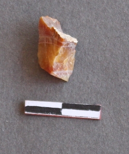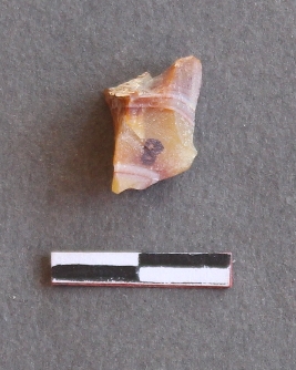 | Description / विवरण | It is an agate fragment, with bulb of percussion on ventral side of the fragment. Flake ridges on the surface. It is a banded agate and translucent in appearance. |