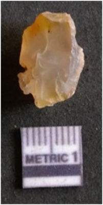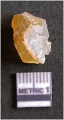 | Description / विवरण | The quartz flake has sharp flaked edges and pointed ends as a result of flaking. The piece is semi-transparent in nature with irregular fracture pattern. The piece is roughly triangular in shape and has a prominent bulb of percussion. |