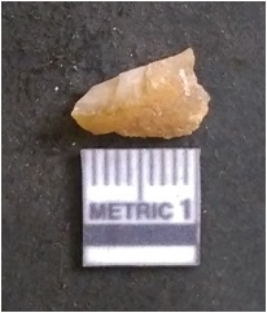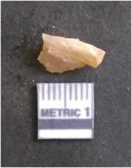 | Description / विवरण | The chalcedony flake is pale in colour and translucent in appearance. The piece has s harp flaked ends and a bulbous end due to flaking. The flake has a crypto-crystalline silica matrix. |