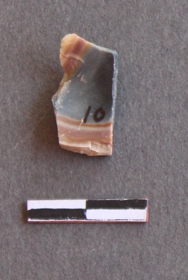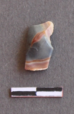 | Description / विवरण | It is a jasper fragment, with a striking platform, cortex on one end; there are many flake scars with ripples on it. |