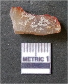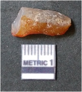 | Description / विवरण | The carnelian flake is elongated with sharp edges and flake scars on the surface. The flake has a positive bulb of percussion on the surface. |