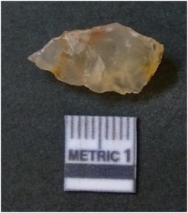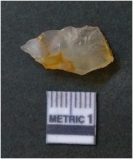 | Description / विवरण | It is chalcedony flake, translucent in appearance. The piece shows sharp pointed ends and flake scars on the surface as a result of flaking. The piece shows a bulb of percussion. |
