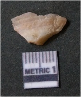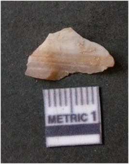 | Description / विवरण | The banded agate flake is elongated with sharp edges and flake scars on the surface. The flake has a positive bulb of percussion on the surface. |