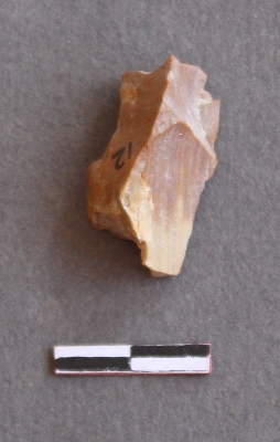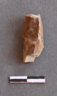 | Description / विवरण | It is an agate fragment, with bulb of percussion on ventral side of the fragment. Flake ridges on the surface. It is a banded agate and translucent in appearance. |