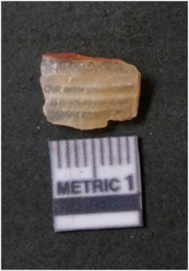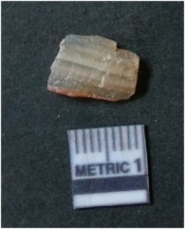 | Description / विवरण | The banded agate piece is crystalline in nature, with a smooth fracture pattern and visible bands on the flaked sides. The piece is pale in color and has sharp flaked ends. |
