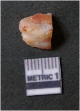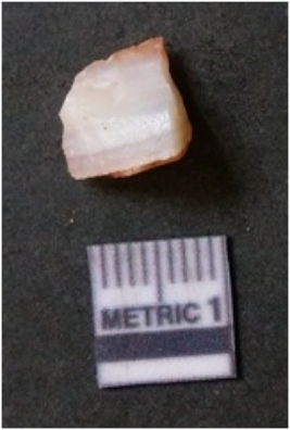 | Description / विवरण | The flake has irregular fracture pattern and sharp flaked edges as a result of lithic knapping activity. The piece is pale, with surfacial flake scars and a bulbous end. The quartz flake is rosy white in colour. |