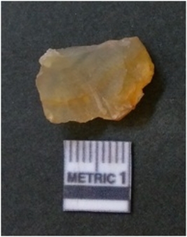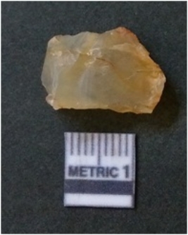 | Description / विवरण | It is chalcedony flake, translucent in appearance. The piece shows sharp pointed ends and flake scars on the surface as a result of flaking. The piece shows a bulb of percussion. |