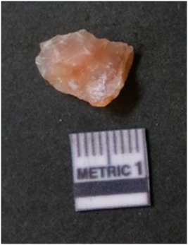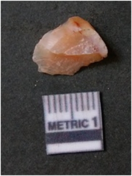 | Description / विवरण | The flake has irregular fracture pattern and sharp flaked edges as a result of lithic knapping activity. The piece is pale, with surfacial flake scars and a bulbous end. The quartz flake is rosy white in colour. |