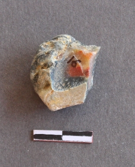 | Description / विवरण | It is a jasper fragment, with a striking platform, cortex on one end; there are many flake scars with ripples on it. |