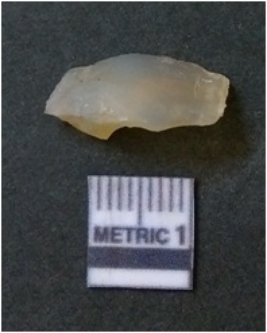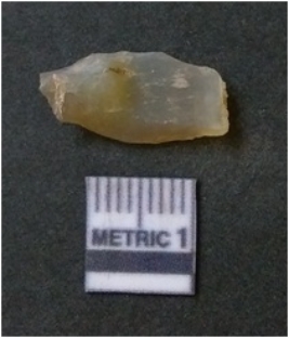 | Description / विवरण | The agate piece is translucent in appurtenance, with angular flaked edges and a bulb of percussion. The piece shows flake scars on the surface. |