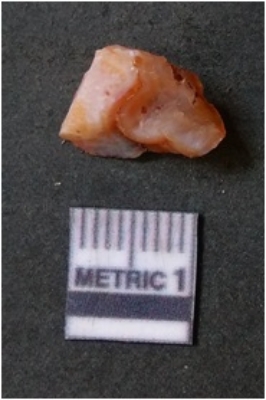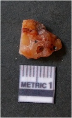 | Description / विवरण | The flake has irregular fracture pattern and sharp flaked edges as a result of lithic knapping activity. The piece is pale, with surfacial flake scars and a bulbous end. The quartz flake is rosy white in colour. |