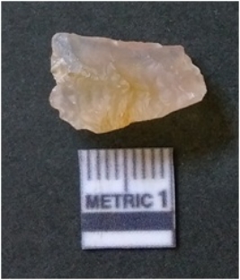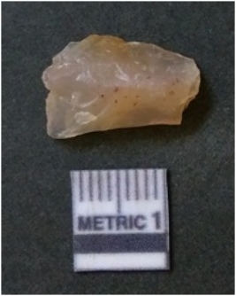 | Description / विवरण | It is chalcedony flake, translucent in appearance. The piece shows sharp pointed ends and flake scars on the surface as a result of flaking. The piece shows a bulb of percussion. |
