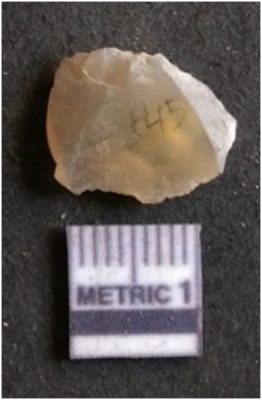 | Description / विवरण | The quartz flake has sharp flaked edges and pointed ends as a result of flaking. The piece is semi-transparent in nature with irregular fracture pattern. The piece is roughly triangular in shape and has a prominent bulb of percussion. |