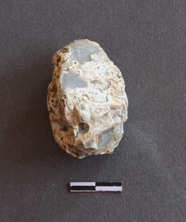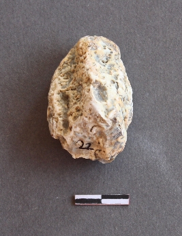 | Description / विवरण | It is a quartz nodule, with a striking platform, cortex on one end; there are many flake scars with ripples on it. |