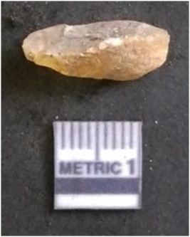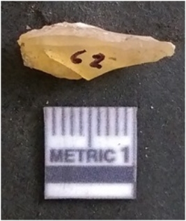 | Description / विवरण | The chalcedony flake is pale in colour and translucent in appearance. The piece has s harp flaked ends and a bulbous end due to flaking. The flake has a crypto-crystalline silica matrix. |