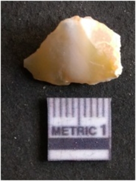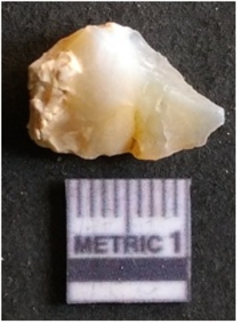 | Description / विवरण | It is chalcedony flake, translucent in appearance. The piece shows sharp pointed ends and flake scars on the surface as a result of flaking. The piece shows a bulb of percussion. |