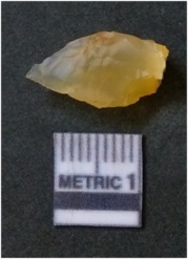| Description / विवरण | It is chalcedony flake, translucent in appearance. The piece shows sharp pointed ends and flake scars on the surface as a result of flaking. The piece shows a bulb of percussion. |