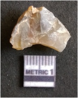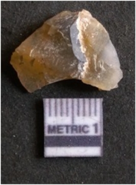 | Description / विवरण | The quartz quartz flake has sharp flaked edges and pointed ends as a result of flaking. The piece is semi-transparent in nature with irregular fracture pattern. The piece is roughly triangular in shape and has a prominent bulb of percussion. |