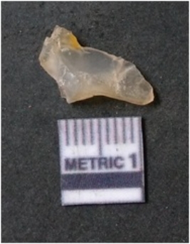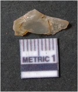 | Description / विवरण | It is chalcedony flake, translucent in appearance. The piece shows sharp pointed ends and flake scars on the surface as a result of flaking. The piece shows a bulb of percussion. |