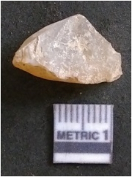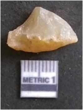 | Description / विवरण | The chalcedony flake is pale in colour and translucent in appearance. The piece has s harp flaked ends and a bulbous end due to flaking. The flake has a crypto-crystalline silica matrix. |