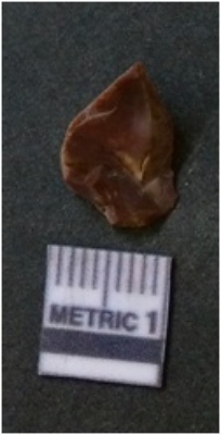 | Description / विवरण | The jasper fragment has sharp flaked edges and a bulb of percussion. The piece is dark in color and has crypto crystalline matrix. Flake scars are visible on the surface and bulb of percussion is present as a result of lithic knapping activity. |
