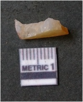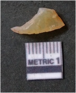 | Description / विवरण | It is chalcedony flake, translucent in appearance. The piece shows sharp pointed ends and flake scars on the surface as a result of flaking. The piece shows a bulb of percussion. |