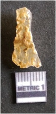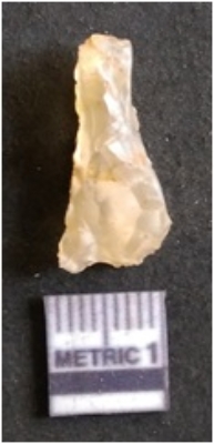 | Description / विवरण | It is chalcedony flake, translucent in appearance. The piece shows sharp pointed ends and flake scars on the surface as a result of flaking. The piece shows a bulb of percussion. |