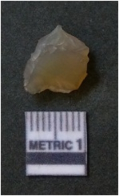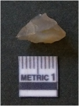 | Description / विवरण | It is chalcedony flake, translucent in appearance. The piece shows sharp pointed ends and flake scars on the surface as a result of flaking. The piece shows a bulb of percussion. |