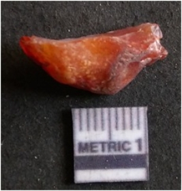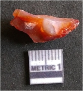 | Description / विवरण | It is carnelian flake red in color, with sharp flakes edges and a small bulb of percussion owing to knapping activity. The piece has sharp flaked edges and a crypto-crystalline matrix. |