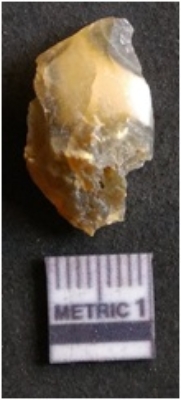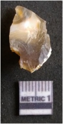 | Description / विवरण | It is chalcedony flake, translucent in appearance. The piece shows sharp pointed ends and flake scars on the surface as a result of flaking. The piece shows a bulb of percussion. |