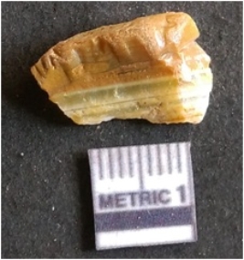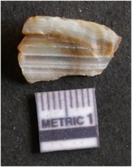 | Description / विवरण | The banded agate piece is crystalline in nature, with a smooth fracture pattern and visible bands on the flaked sides. The piece is pale in color and has sharp flaked ends. |