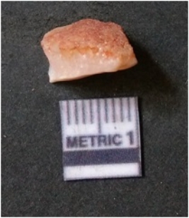 | Description / विवरण | The flake has irregular fracture pattern and sharp flaked edges as a result of lithic knapping activity. The piece is pale, with surfacial flake scars and a bulbous end. The quartz flake is rosy white in colour. |
